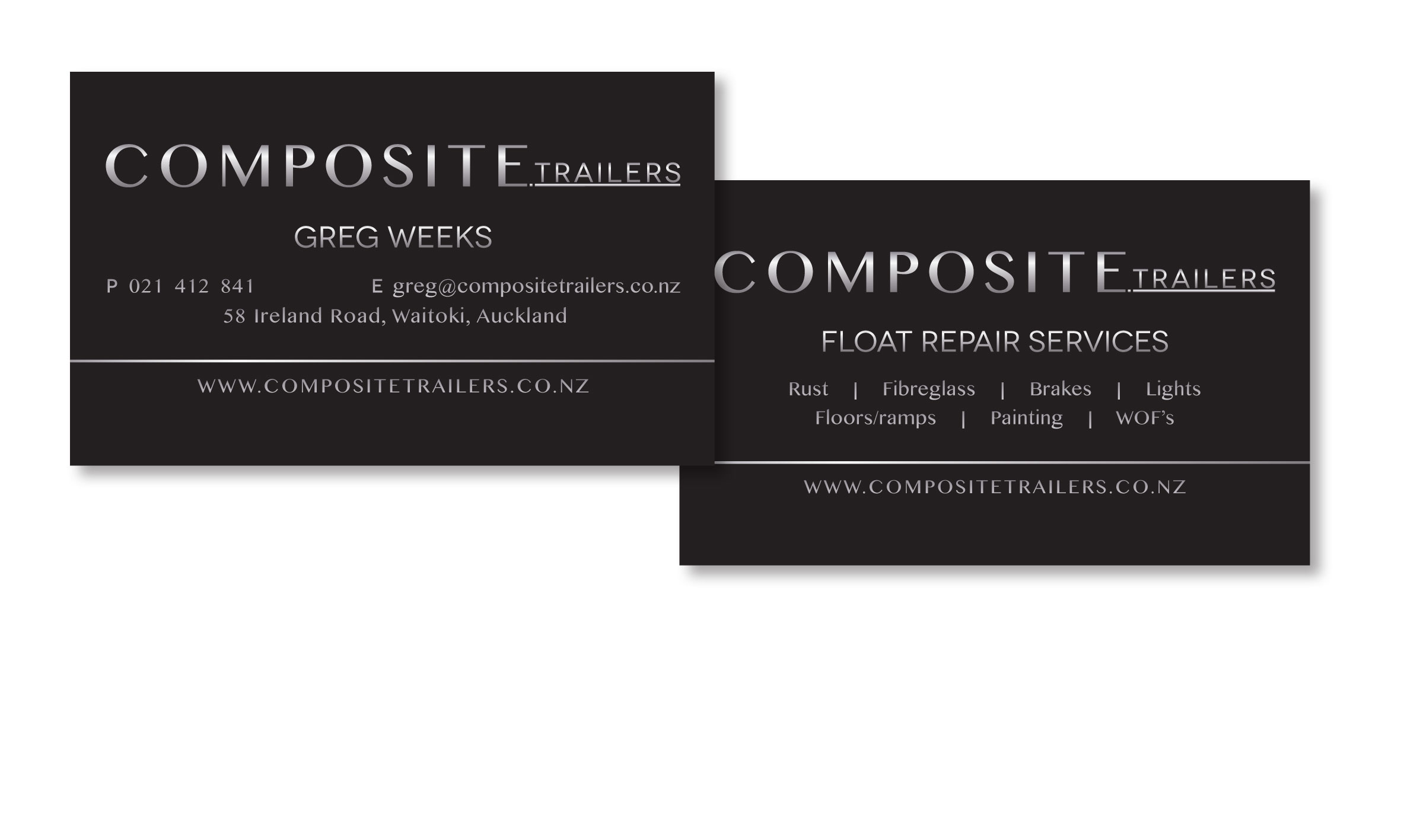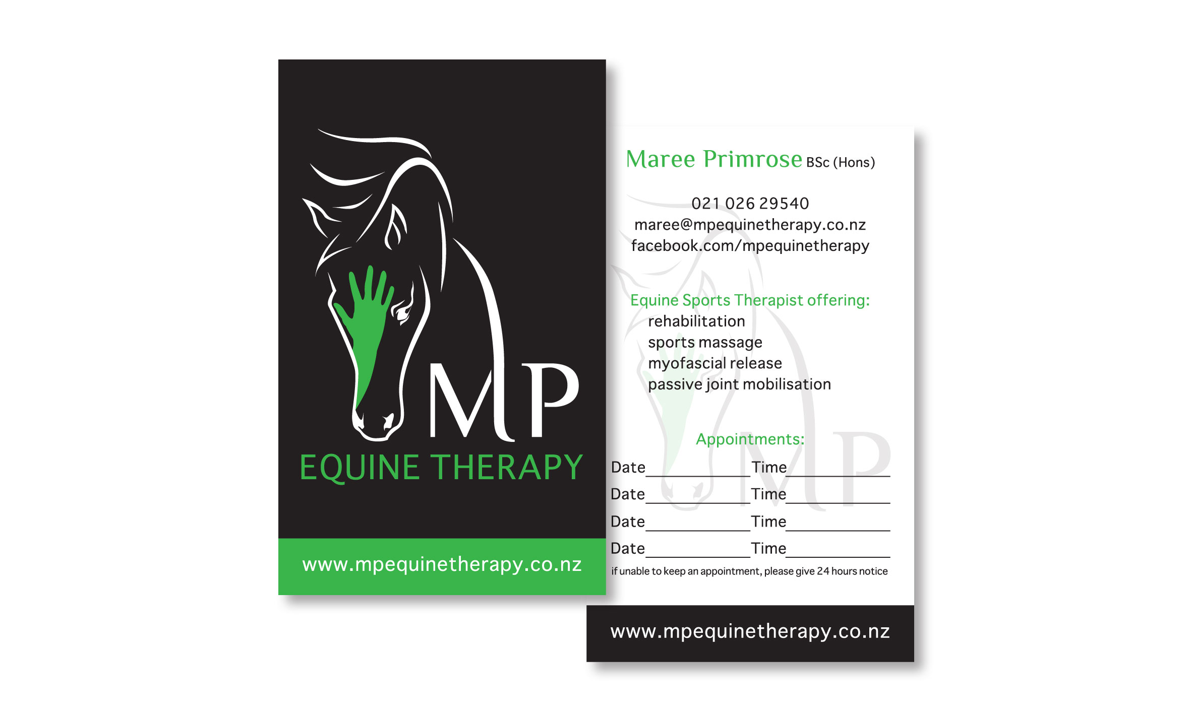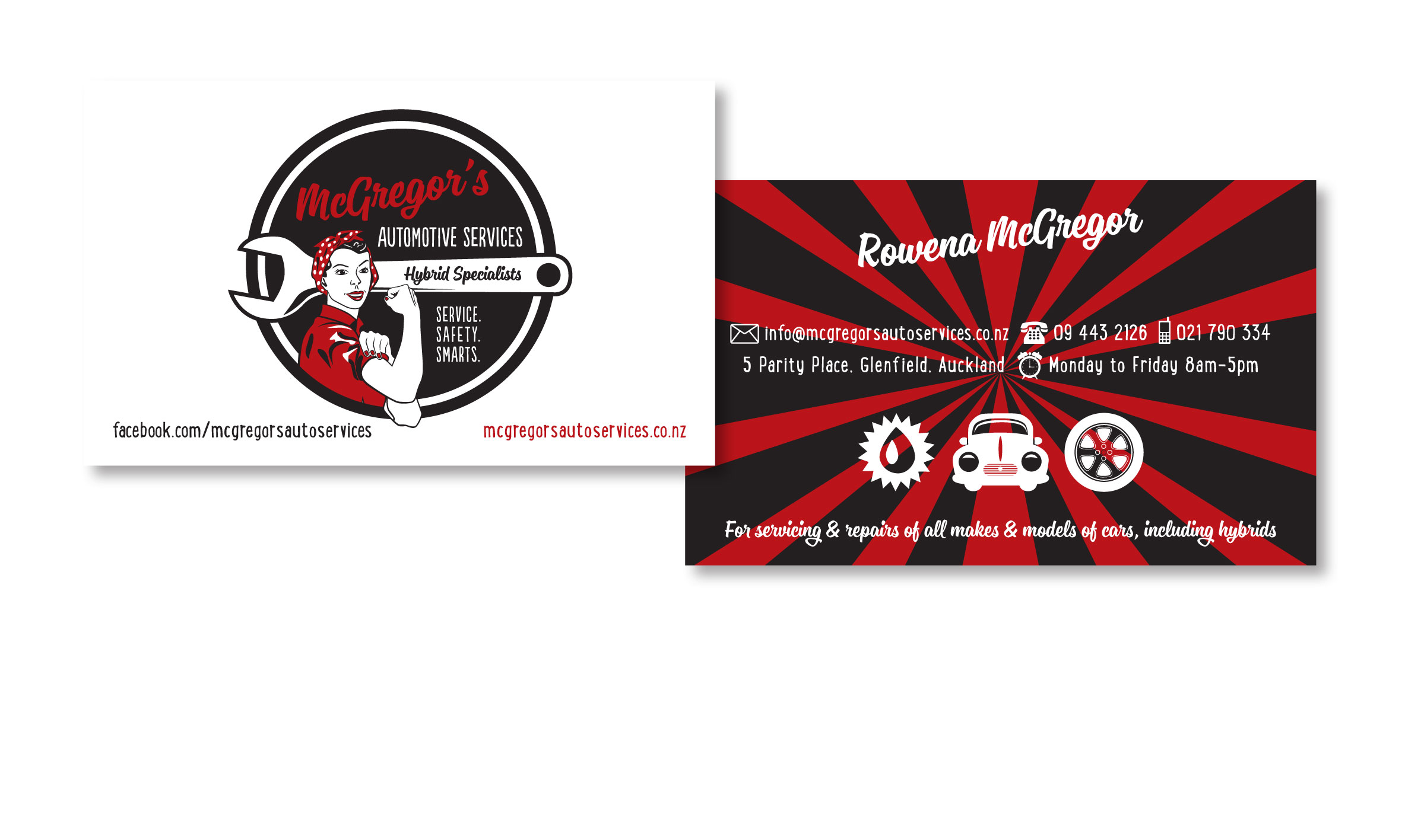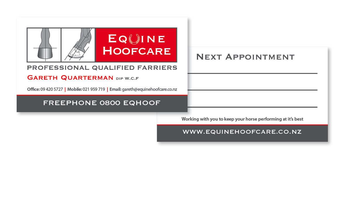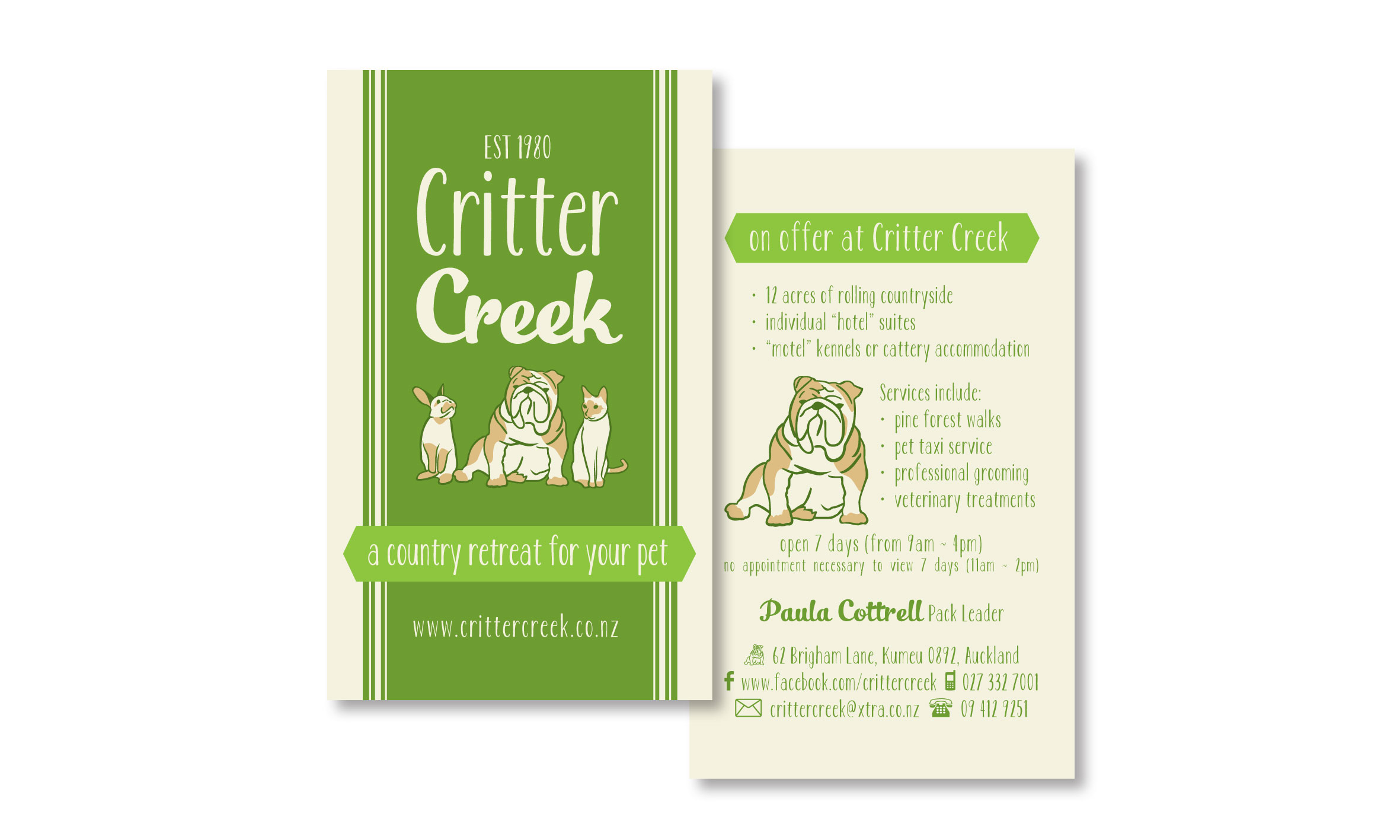- Include contact details, logo, website, hours, possibly services on reverse
