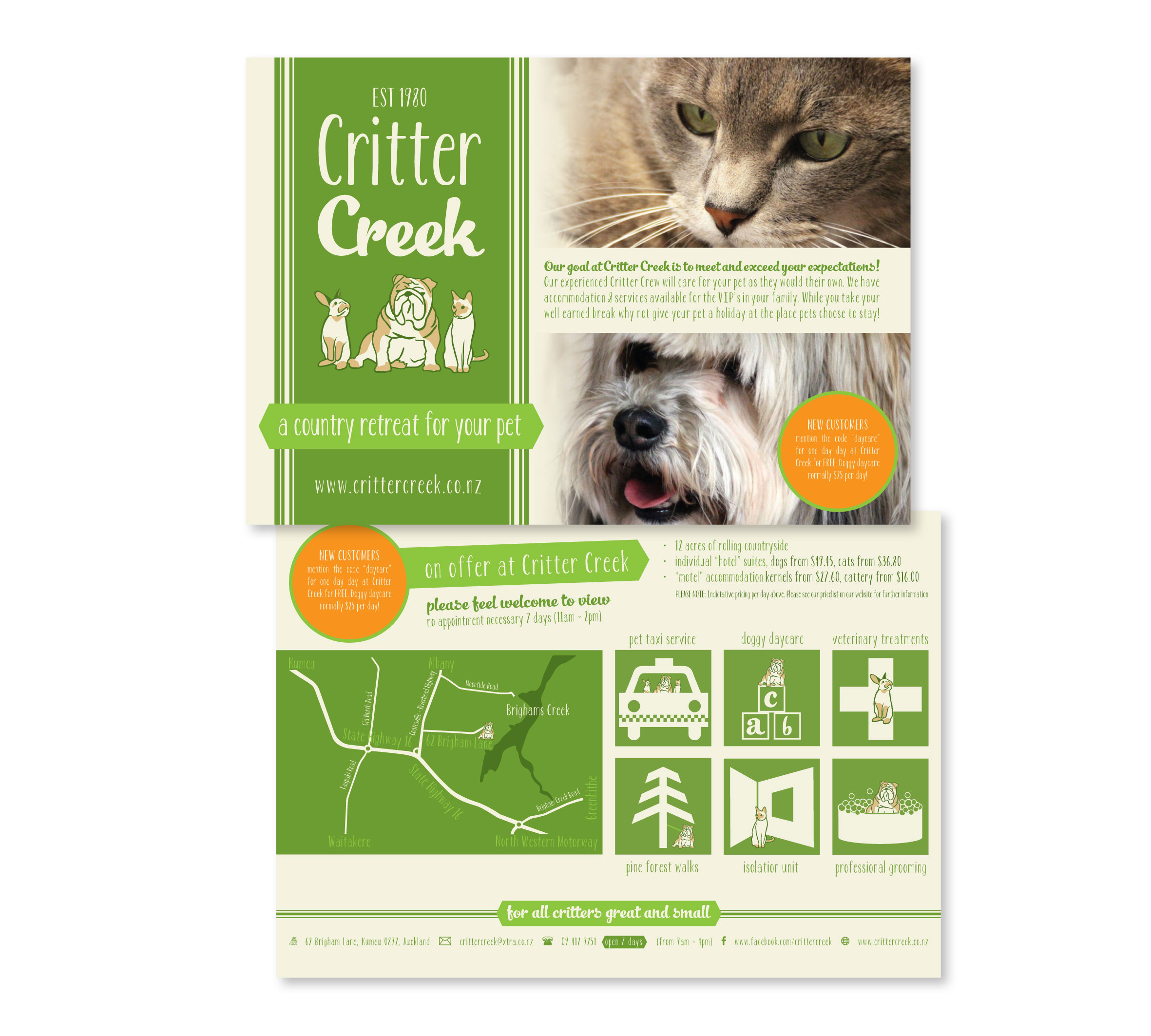 - Simple flyer DL or A5 double sided (including logo, contact details, photo/s, services, map creation) $140 – $210